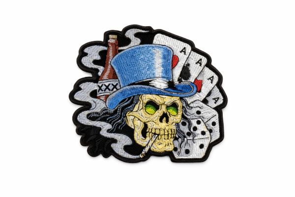 Gambling Skull With Top Hat 8 x 7cm Quality Embroidered Patch with Heat Seal Backing.